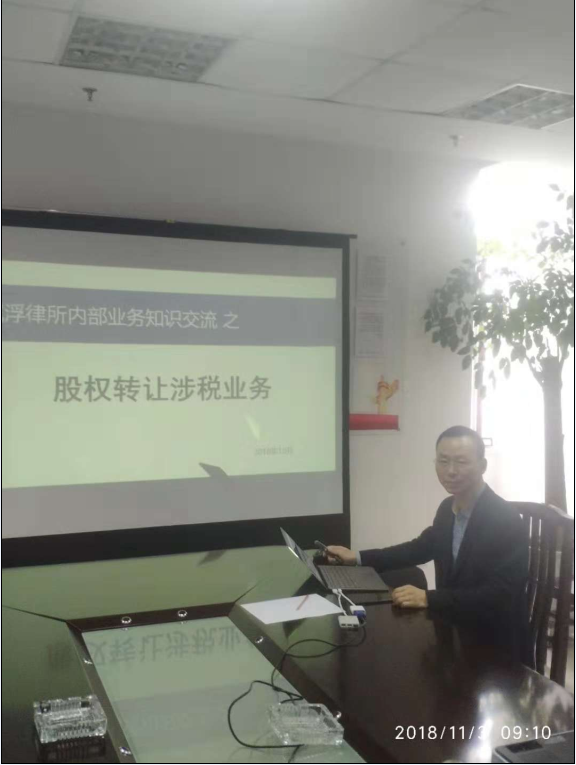 2018年11月3日,我所在本部进行主题为股权转让涉税业务的内部业务知识交流讲座。精通税法专业的常豪律师为大家带来了一场精彩的讲座。现场气氛热烈,参加人员事后均表示受益匪浅。